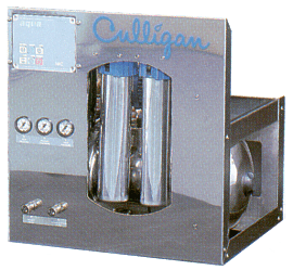 Wandmontage, rotierende Flügelpumpe, Einlassmagnetventil, Vorfiltereinsatz zu M1-2S, Ablauf und Rezirkulationsventil, Druckanzeige, FRP Membrangehäuse, elektrischer Durchflussmesser, Culligan-Steuereinheit